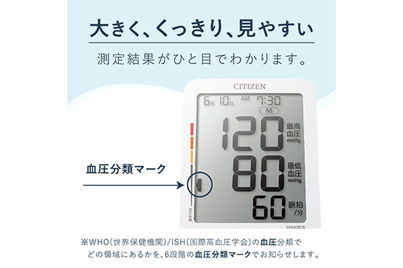 測定された血圧値をWHO(世界保健機関)/ISH(国際高血圧学会)の血圧分類にもとづいて、6段階で表示します。