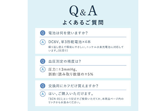 | 質量 | 本体:約390g(電池含まず)、カフ(腕帯):約130g |