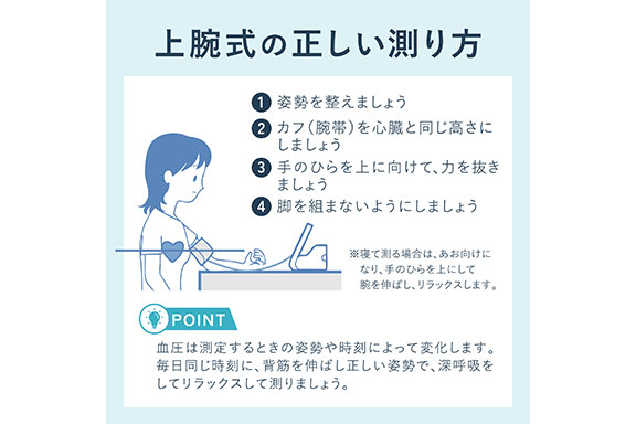 カフの青い帯を腕の内側に合わせて巻き、測定します。適用腕周範囲は22~32cmです。