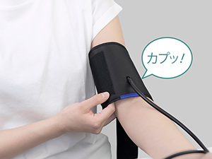 U字型の新形状「カプッとカフ」は腕に通す必要がなく、楽な姿勢のまま片手で腕に簡単装着。