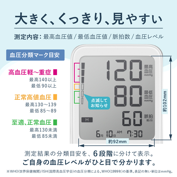 測定された血圧値をWHO(世界保健機関)/ ISH(国際高血圧学会)の血圧分類にもとづいて6段階で表示します。