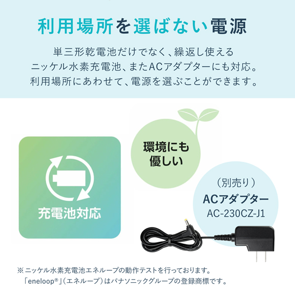 - ※パナソニック製ニッケル水素充電池、エネループ、または充電式エボルタ対応(別売り)