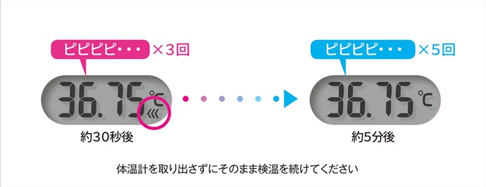 - 約5分後の実測検温終了時にブザーがピピピピと5回鳴り、実測検温が終了したことをお知らせします。