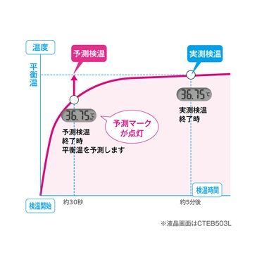 体の内部とおなじくらいの温度になった状態を「平衡温」と言います。平衡温を測るには口中検温で5分以上かかります。本製品は当社独自のセンサーと予測機能により平衡温を約30秒で予測します。