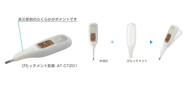 「体温計が測定中にずり落ちてしまう」、「挟みづらい」などの際には、専用アタッチメントの「ぴたッチメント」が便利です。