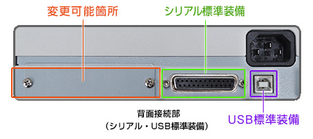 | インターフェース | シリアル(RS-232C)、USB(2.0準拠) オプション:有線LAN(有線LAN)、無線LAN(IEEE802.11b/g/n) |