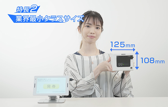 専用タブレット端末と業界最小クラス(高さ108㎜、横幅125㎜)のサーマルプリンターがセットになった整理券・順番待ち発券機。